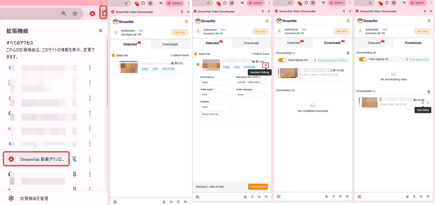 拡張機能マークから右上の StreamFab アイコンをクリックしてログインします。対応サイトで動画を再生すると、自動で動画が検出されます。