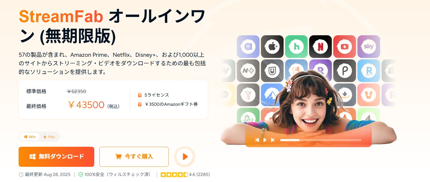 StreamFabは、DRM保護された動画コンテンツを効率的にダウンロード・保存できる有料ソフトウェアです。NetflixやAmazonプライムビデオ、Hulu、Disney+など主要な動画配信サービスに対応しており、高品質な映像をそのままの画質でMP4やMKV形式などで保存可能です。録画に比べてダウンロード速度が速く、再生時間に縛られないため大幅に時間短縮が図れます。また、複数ファイルの一括ダウンロードにも対応し、保存失敗のリスクも低減しています。