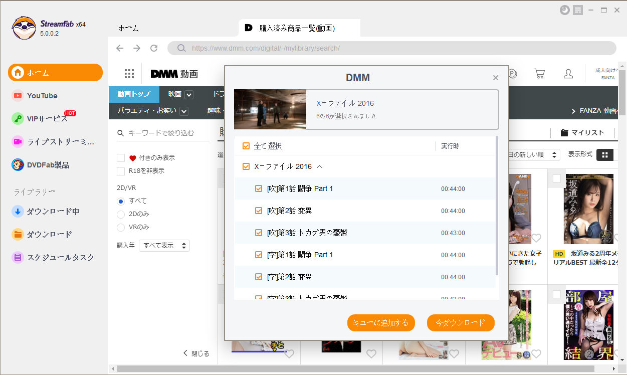 4. シリーズの場合は一括ダウンロードするか、外したい対象動画があればチェックを外せば良い。言語や字幕の選択も可能、決めたら「すぐダウンロード」もしくは「ダウンロードキューに追加」を押してダウンロードを行います。