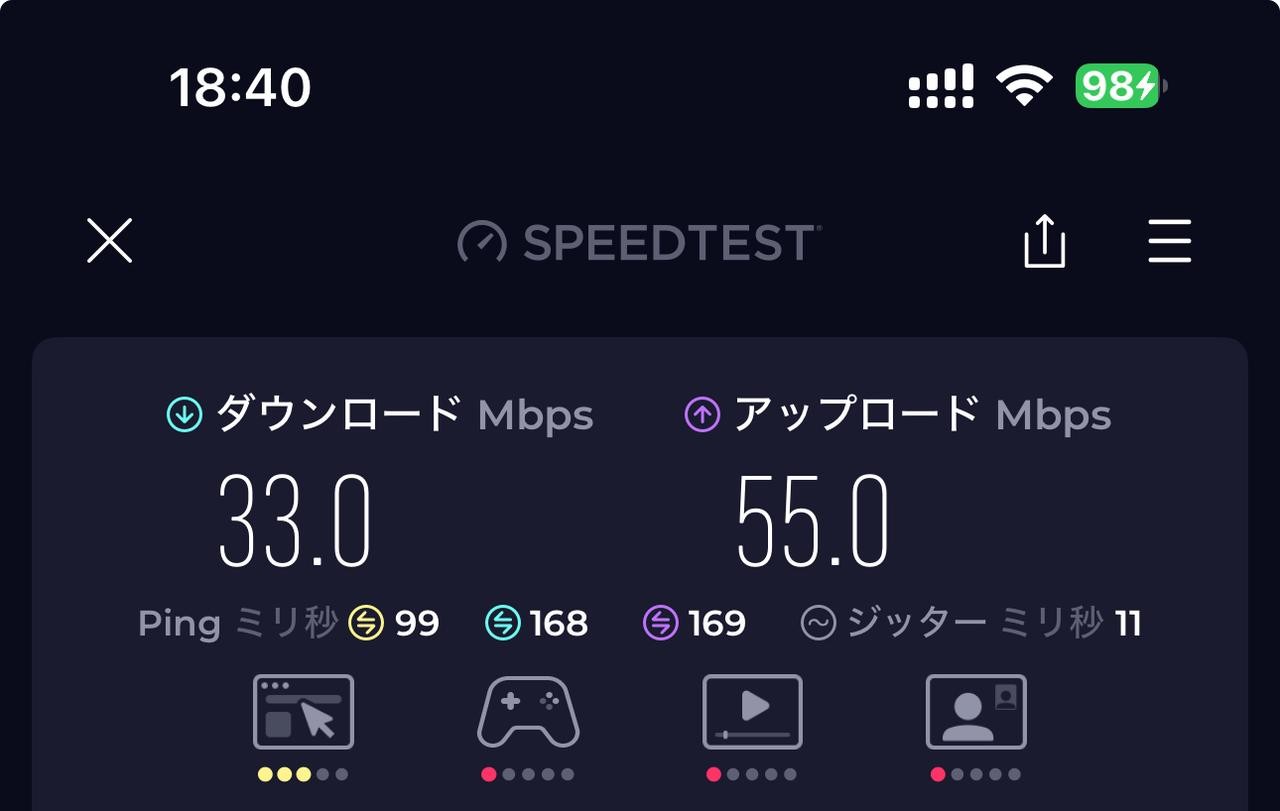 - 下り:33.0 Mbps / 上り:55.0 Mbps