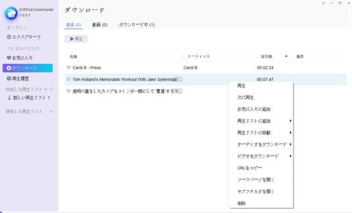 ダウンロードしたファイルが上部に表示される「ダウンロード中」から「動画」または「音楽」に移ります。そこで、プレイリスト(再生リスト)と似たような形で、ファイルが保管されています。該当動画または音楽を右クリックすると、再生、お気に入りに追加、即存の再生リストに移動などのさまざまな管理を行えます。