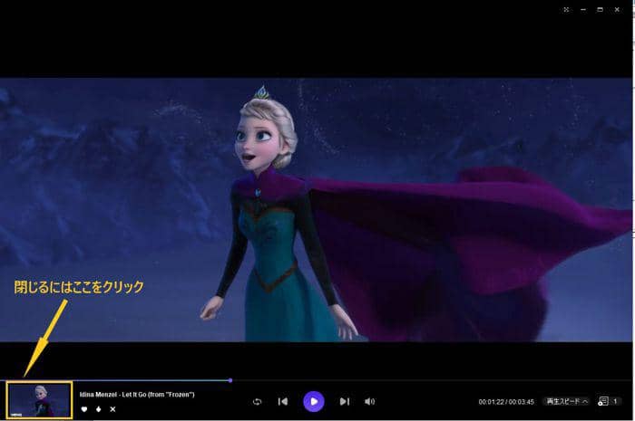 ・ヒント:再生画面の左下のサムネイルをクリックすれば、再生ウィンドウを閉じることができますが、右上の「×」をクリックすると、プログラム全体が終了しますので、くれぐれもご注意ください。