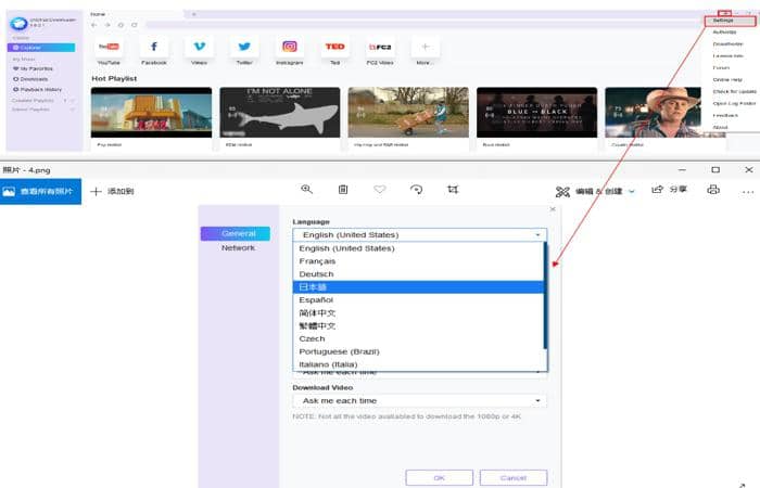 一番上にある「Language」から日本語を選択すれば、表示言語が「日本語」に変更できます。ここで、保存先フォルダ、ダウンロードする音楽と動画の品質、およびウィンドウを閉じる時にソフトの動作などを自由に指定可能です。