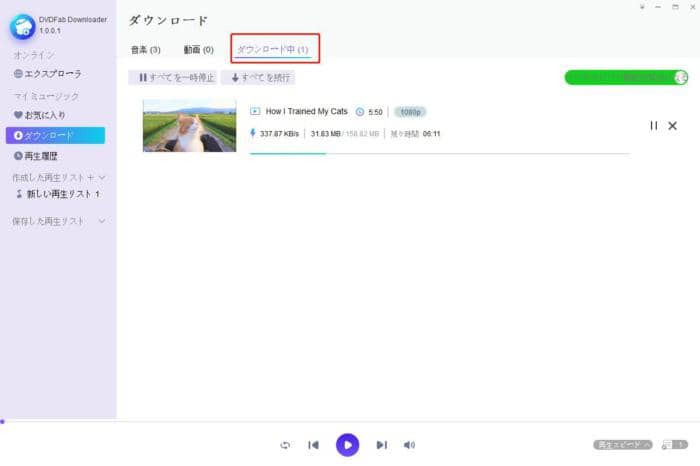 メイン画面の左側にある「ダウンロード」タブで、ダウンロード中の動画と音楽がいつでも確認できます。vr 動画 ダウンロードについての問題なら、右上のスライドをクリックして有効(緑色)にすれば、ターボスピードで10倍速く動画・音楽をダウンロードして、瞬時に完了することができます。