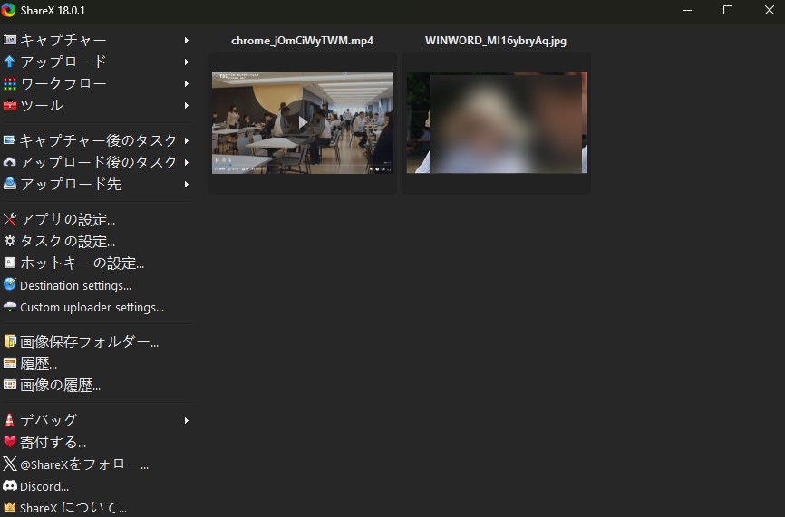 - ShareX:軽量。領域録画・FFmpeg録画・GIF出力などが手早い。