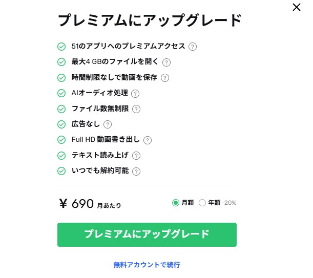 料金:基本は無料。上級機能は有料、例えば、1080p画質で保存したり、広告削除したり、時間制限やファイル数に制限がなかったり、テキスト読み上げしたりする場合は有料となります。月額690円、年額の場合は2割引。